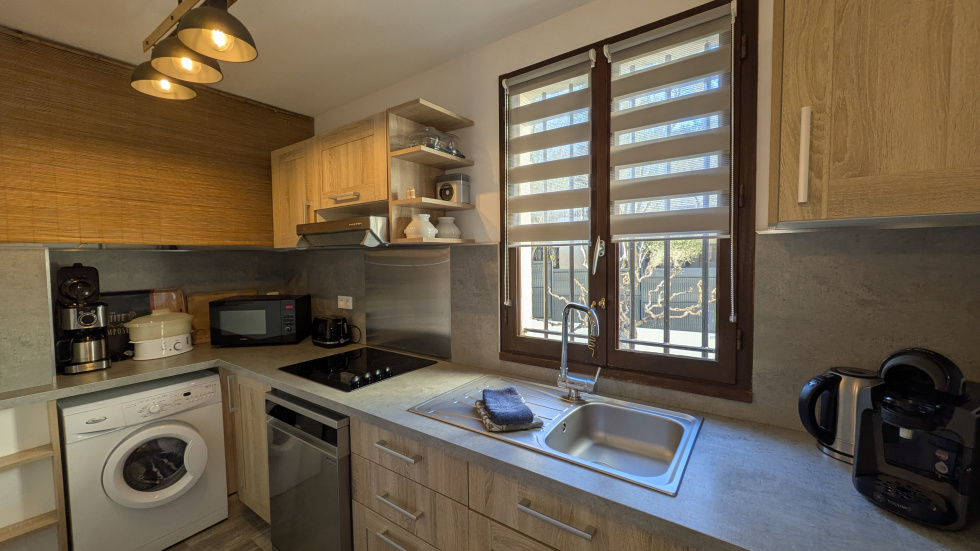 Grand séjour (canapé convertible 2 couchages) ouvert sur une large terrasse exposée sud-est avec vue jardin piscine et mer, cuisine indépendante entièrement équipée, chambre double, salle de douche aménagée (grande douche à l'italienne), toilettes séparées.