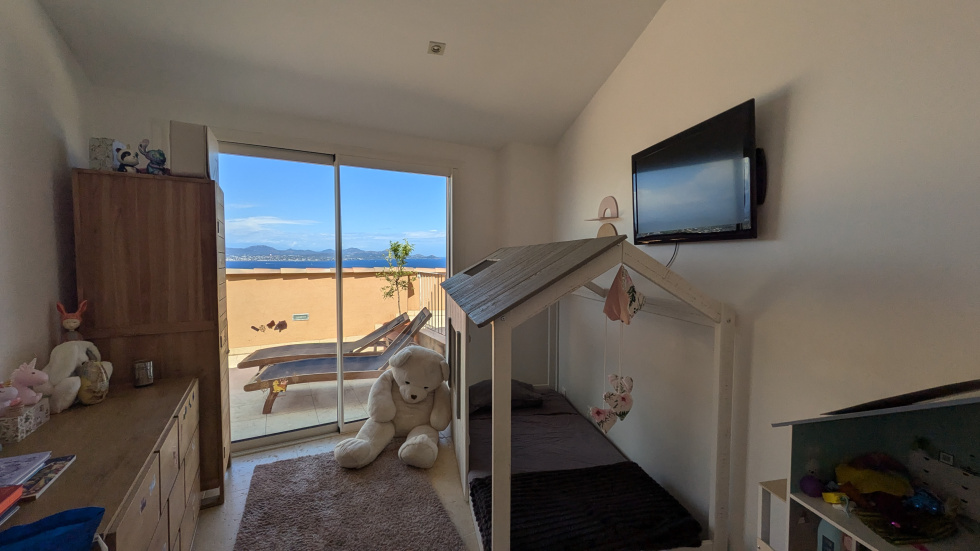 A l'étage suite parentale composée d'une chambre (lit 200 cm) avec baignoire ilot, salle de douche et terrasse face mer, une deuxième chambre (lit 160 cm) avec sa terrasse, une troisième chambre (lit 160 cm) avec douche, une quatrième chambre (banquette convertible 140 cm), une chambre avec lit enfant, salle de douche commune, 4 toilettes.