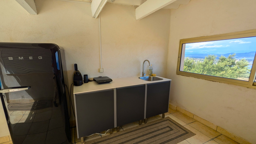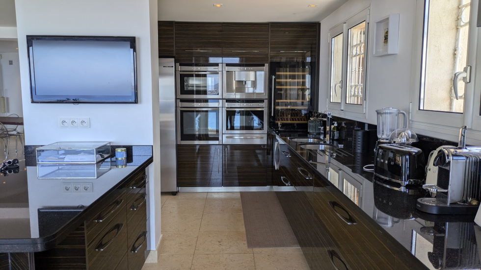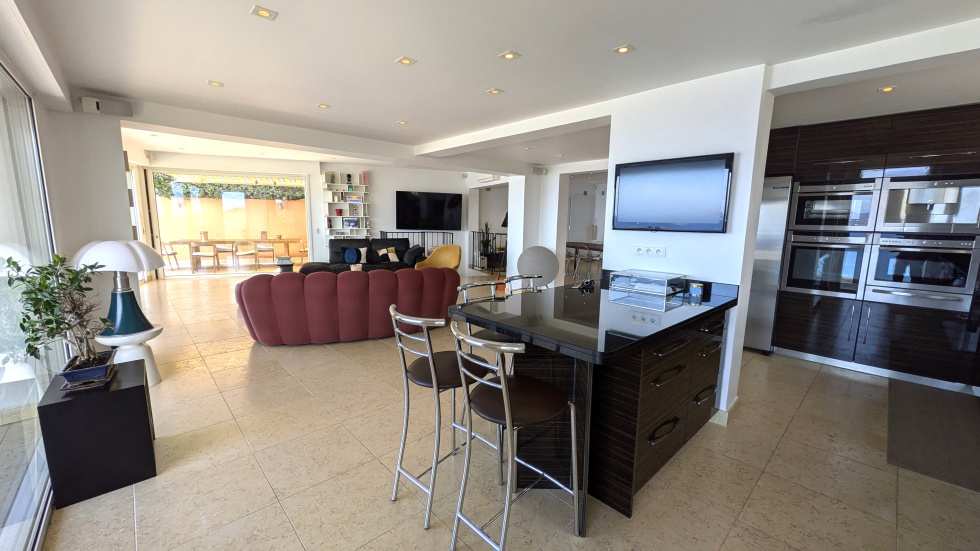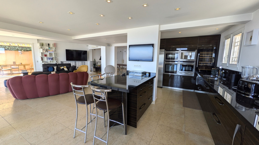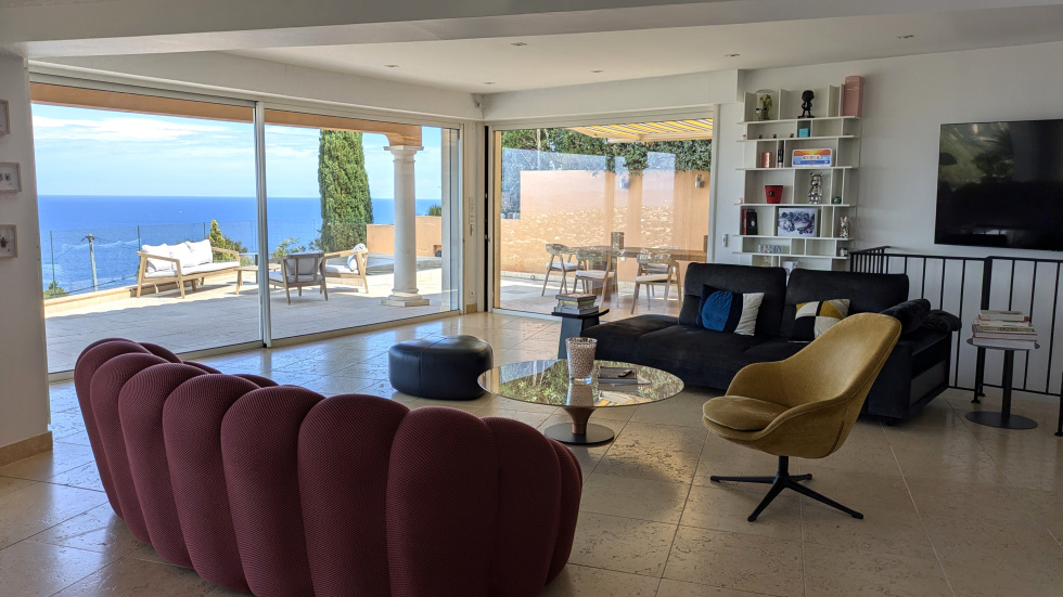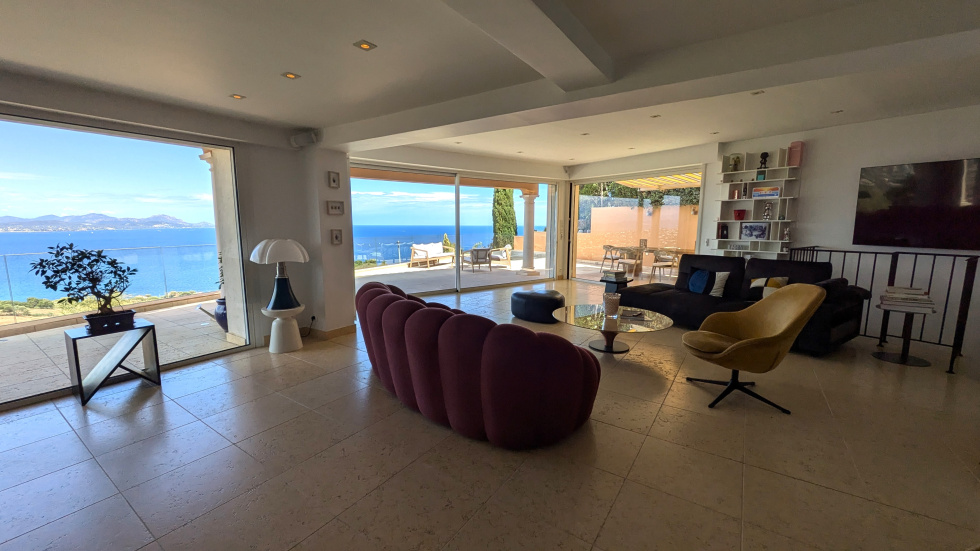 Vaste pièce de réception ouverte par de larges baies sur une terrasse avec jacuzzi surplombant la mer et la baie de Saint-Raphaël, cuisine américaine dotée d'un équipement complet haut de gamme, cuisine d'été.