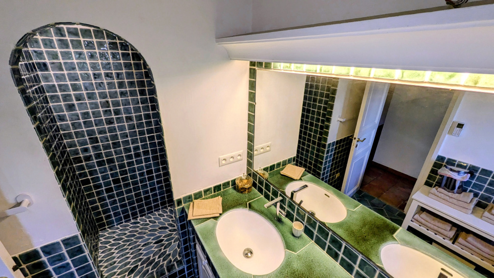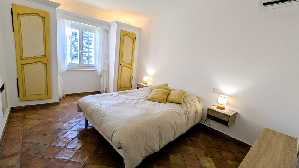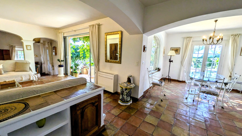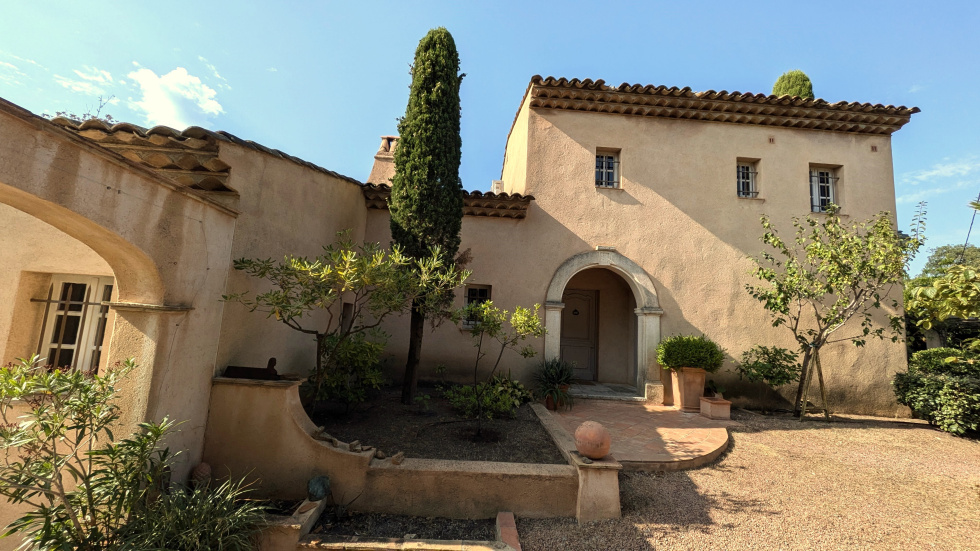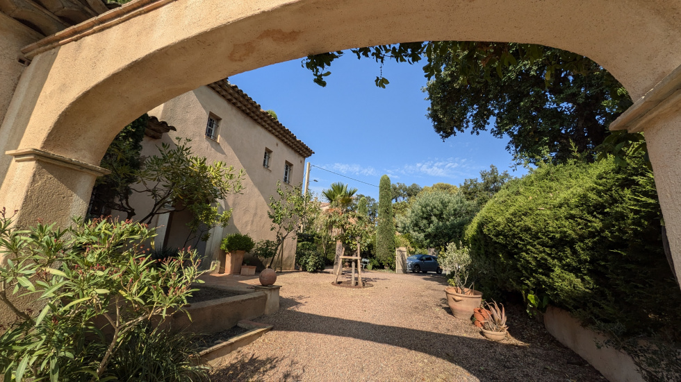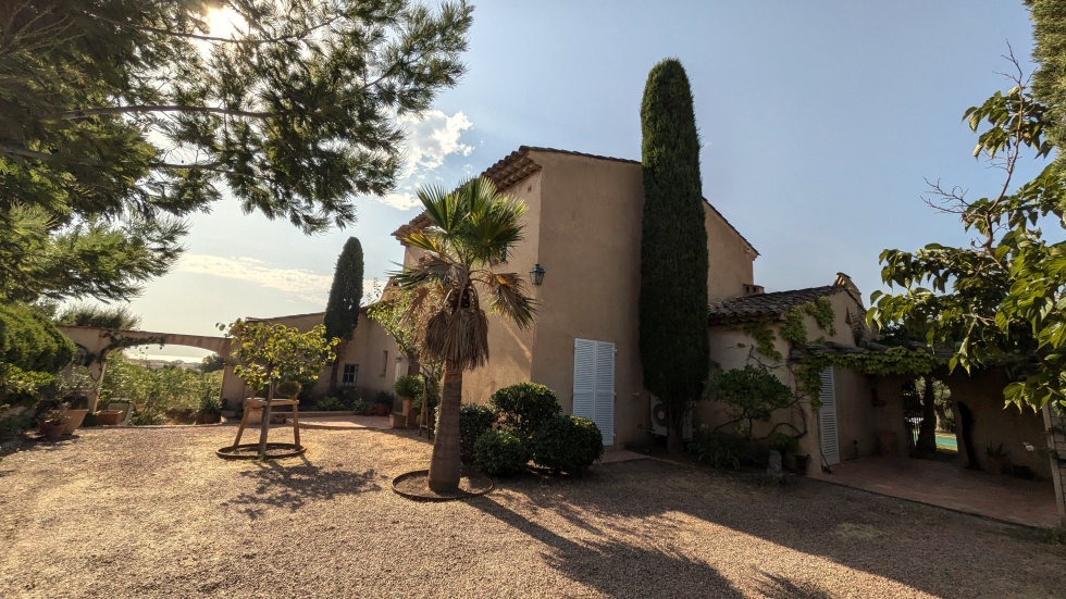 Piscine traditionnelle au coeur d'une confortable pelouse bordée de vieux oliviers. Terrasse patio à l'ombre d'une treille propice à la sieste ou la lecture, terrasse couverte abritant une cuisine d'été entièrement équipée (avec barbecue & plancha).