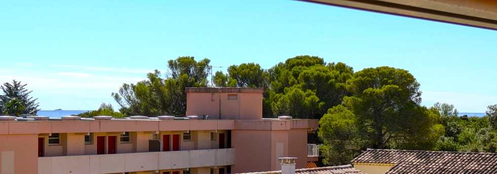 Beau balcon de 4,50 m² ensoleillé dès le matin, agrémenté d'un store, au grand calme avec aperçu mer.