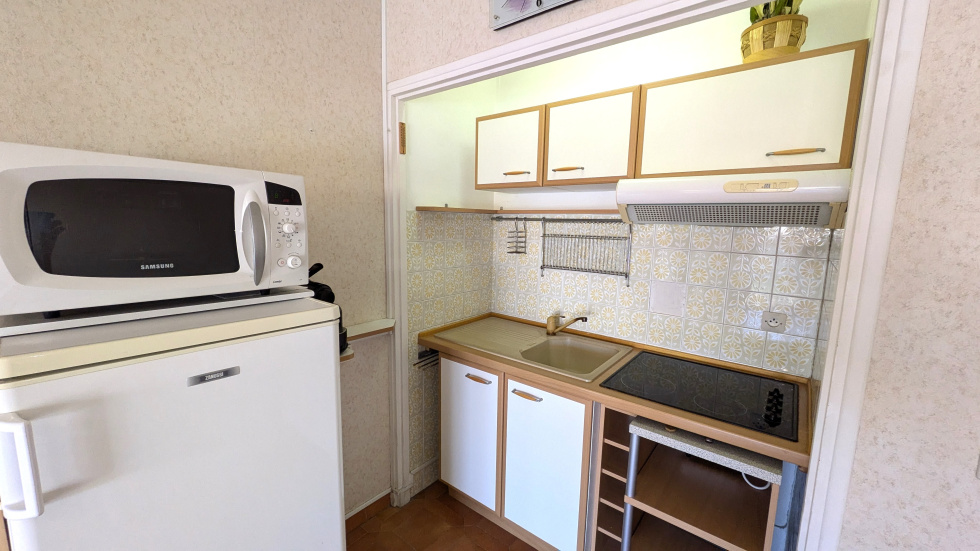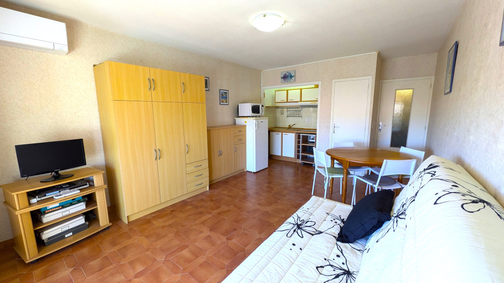 Hall d'entrée avec placard, grand séjour équipé de la climatisation réversible, coin cuisine aménagé, salle de douche avec lave-linge, toilettes.