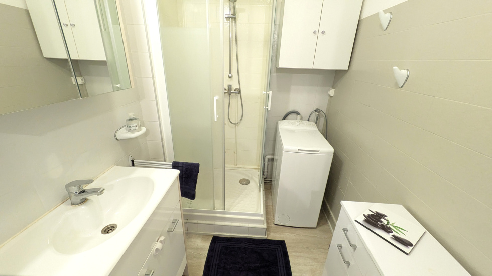 Hall d'entrée avec placard, grand séjour ouvert par une large baie sur une terrasse ensoleillée avec vue jusqu'à la mer, espace cuisine aménagé, salle de douche avec lave-linge, toilettes.